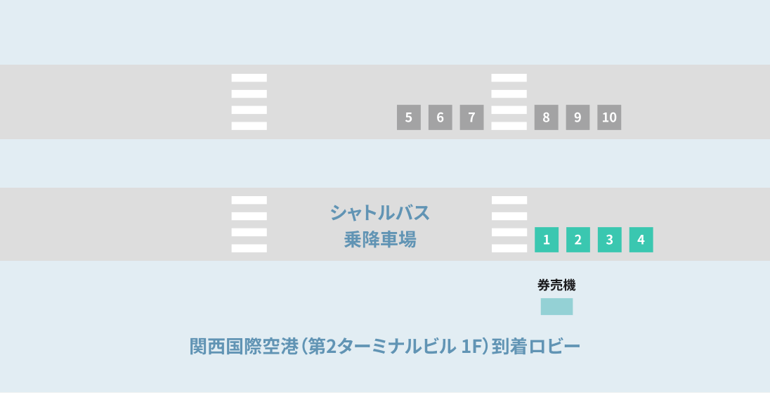 トップ のりば案内 関西国際空港 KIX 関西国際空港 印刷する 券売機より乗車券をお買い求めのうえ、ご希望の行き先ののりばでお待ちください。 のりば 行き先 第1ターミナル 第2ターミナル 5 1 UM 大阪駅前(梅田) 8 2 ITM 大阪(伊丹)空港 8 2 KY 京都 6 4 KB 神戸(三宮)・六甲アイランド 4 3 NS 西宮