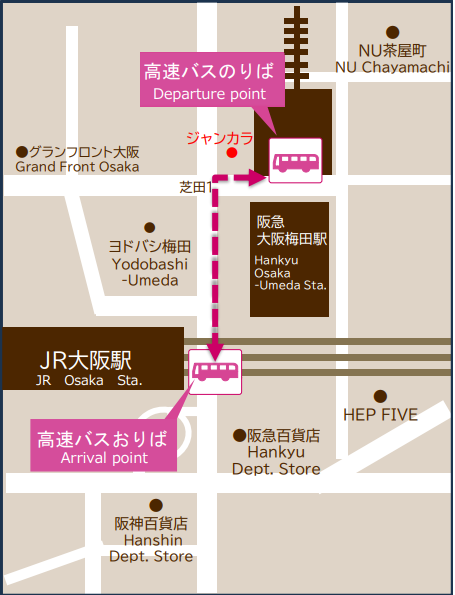 JR大阪駅の御堂筋口を出て、阪急百貨店の方向(東側)へ横断歩道をお渡りください。渡ってすぐ左へ(北へ)向かってガード下をくぐり抜けて直進してください。スクランブル交差点のある通りを右に(東に)入ると、阪急電鉄のガード下に高速バスのターミナルがあります。